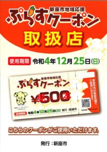 新座市が発行している「ぷらすクーポン」につきましては、新座農産物直売センターでのお買い物や、野火止・新座支店での購買品や店頭野菜販売の購入にご利用いただけます。
