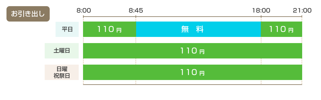 - 祝日が土曜日と重なる場合は、日曜日・祝日のご利用手数料となります。